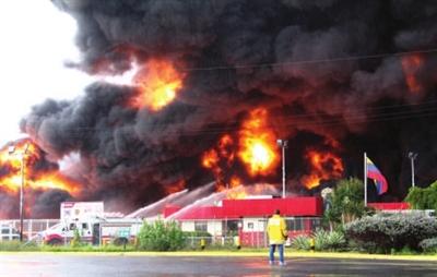 昨日,在委内瑞拉东部拉克鲁斯港,消防员在炼油厂控制火势。位于该国东部的一家炼油厂当天遭遇雷击引发大火,暂时没有人员伤亡的消息。 据新华社 (本报综合消息)