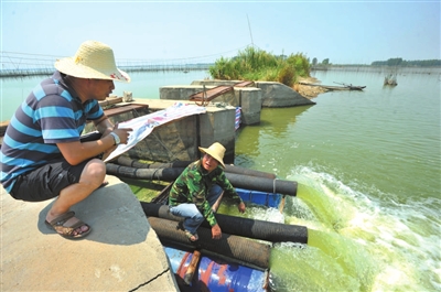 昨日,嘉鱼县官桥镇两湖村养鱼大户李文斌,架起抽水泵从西凉湖往自家鱼塘抽水。旱情发生以后,李文斌主动一边蓄水,一边放水,帮助乡亲们抗旱。 记者 夏正锋 通讯员 高涵 摄