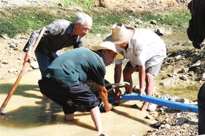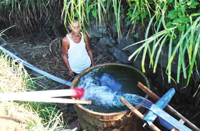 在该乡分管农业的副书记周移房的带领下,村民们在河道挖出多个小井,用水泵将水抽到一百多米远的大木桶里,如此连环,才最后将水送入稻田。