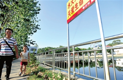 8日,嘉鱼县高铁岭镇临江村村民牵着一名小孩从装有护栏的塘边走过。据了解,当地许多塘堰被挖深拓宽,给当地