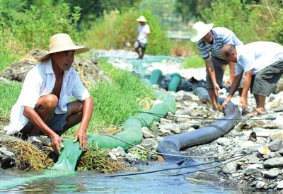 13日,通城县塘湖镇塘湖社区村民正在引水灌田。旱灾导致该镇直接经济损失达800余万元。为了确保百姓生活和灌溉用水,该镇投入劳力8000余个、资金260万元,浇灌农田上万亩。 记者程慧 特约记者铄晖 通讯员 友平摄