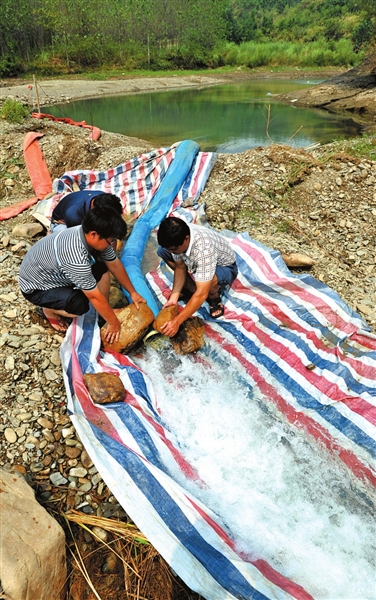 昨日,崇阳县石城镇桂口河上游,桂口村村支书杨佛开和村主任张望龙正在水泵前固定出水口。为了减少村里2000多亩水稻的灾害损失,村干部自筹资金购买彩条布、水泵等抗旱设备提水保良田。 记者 夏正锋 通讯员 张骋刘渊 摄