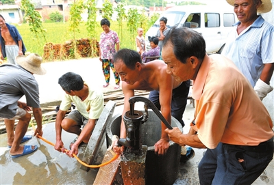 19日,通山县南林桥镇大坪村村干部带领村民压水抗旱。干旱发生以来,该村干部与村民一起清沟渠,找水源,铺水管,确保农作物用水。记者程慧 通讯员 张玲程珍摄