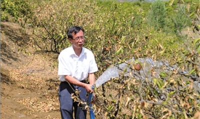 13日,慈口乡党委书记王武任正在帮慈口村一组桔农桔苗浇水。旱情发生以后,该乡党员干部全力以赴,投入抗旱。通讯员 张远杰华梅声果摄