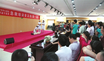 16日,近200位来自不同行业的市民参加了市中心医院同济咸宁医院举办的公众急救知识普及培训班。培训现场,医护人员为市民演示和讲解了心肺复苏术、急救处理术等基本急救技能。免费普及急救知识,旨在发挥大型医院的社会公益性,普遍提高市民的急救能力。记者 孔伏波见习记者赵晓丽 通讯员 陈伟琴摄