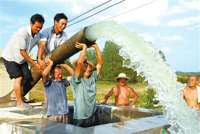 在泉湖村3组,露底的高庄河床上,新开挖的一个大约深3米,10来见方的简易大水井,5台潜水泵沉在水里,呼呼地叫得正欢,几位村民正赤着膀子在井边照看设备。