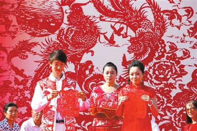 昨日,新人在参加以剪纸文化为主题的集体婚礼。