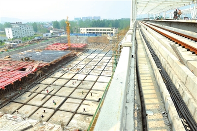 城铁上,南站顶棚建设如火如荼,施工人员行走在钢架间,为龙骨刷漆;城铁下,站前广场建筑拔地而起,地下层浇筑施工也在井然有序地进行。据了解,南站站前广场主体工程将于9月完工。 记者程慧摄