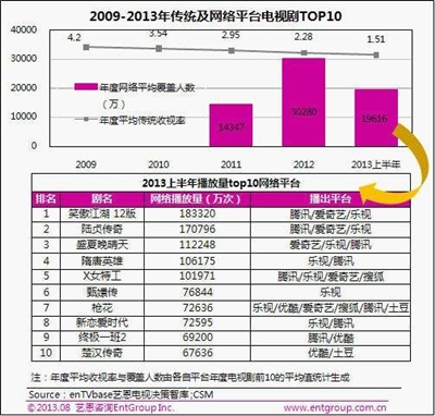 尽管电视收视率低迷,但网络的点播量却依然火爆,这得益于网络话题的热炒效应以及网络收看方式的全面崛起。艺恩咨询的数据显示(如图二),近4年传统电视平台和网络平台的收视率和覆盖人数此消彼长,2013上半年网络视频的年度平均网络覆盖人数就达到近2亿,《新笑傲江湖》的网络点播量高达19亿次,再加上第2名的《陆贞传奇》,“于妈“两部大剧在各大视频网站累积播放量过35亿次,其中《新笑傲江湖》仅在腾讯视频的点播量就突破10亿次。