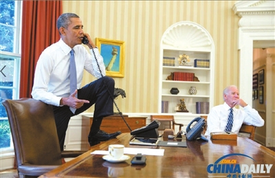 9月1日,美国白宫,奥巴马一脚踩着桌子与众议院发言人约翰·博纳通电话商讨叙利亚问题,确定美国将对叙利亚发起军事打击行动。副总统拜登淡定旁听。