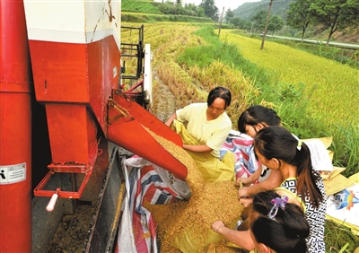 ◀8月27日,崇阳县白霓镇峡山村,当地村民正在收割机旁装袋。 眼下,我市中稻进入收割期,不少粮农抢抓晴好天气,抢收中稻,争取颗粒归仓。 记者 夏正锋 摄