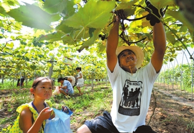 日前,在嘉鱼新街镇晒甲山村葡萄基地,计生户正在领养的葡萄树下采摘。今年,该镇出资5万元购买了两个葡萄大棚,由晒甲山村和港东村50户计生家庭按每户两株的标准免费领养,并组织技术人员提供指导。