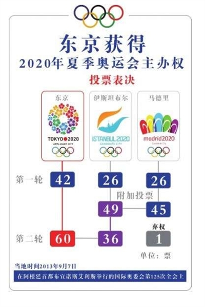 8日凌晨,国际奥委会第125次全体会议在阿根廷首都布宜诺斯艾利斯开幕,当罗格从监票执委那里拿到五环信封的时候,那简直就是一个钻石打造的信封,信封里面的东京几个字则是用金子做的。为2020年奥运会的申办,东京花费了500亿到600亿日元,约合6亿美元。而西班牙和伊斯坦布尔的申办经费加起来也不到4亿美元。