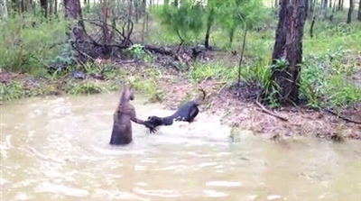 本报综合消息袋鼠是一种极富战斗力的动物,德国獒也以聪明、勇敢知名,这两种动物竟在水里相遇。