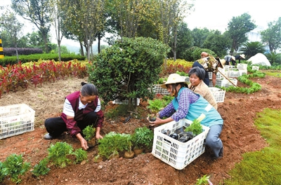 昨日,市园林工人在城区桂乡大道两旁进行绿化布景。随着中秋节和国庆节临近,市园林部门组织人员在繁华路段、交通要道、旅游景点布置各种造型美景,扮靓香城泉都。 记者 袁灿 摄