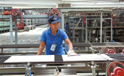 12日,通城陶瓷产业园内,杭瑞陶瓷公司的员工正在生产线上查验瓷砖。