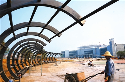 16日,在咸宁温泉旅游新城南入口综合服务区旅游集散中心施工现场,记者看到该项目的主题工程已经完工,正在进行广场的景观及绿化建设。据了解,该工地施工人员日夜加班加点赶进度,月底将完成温泉国际广场的绿化亮化工程。记者 陈红菊摄