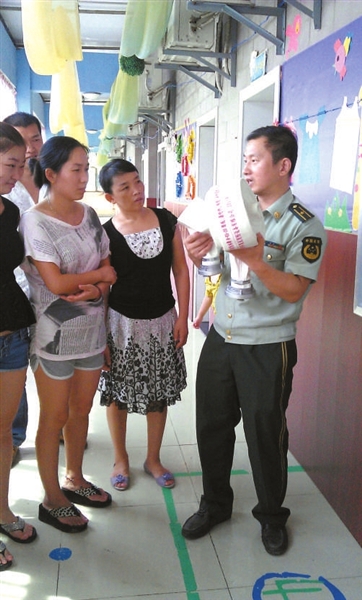 通山县消防官兵为苗苗幼儿园教师讲解消防知识。通山县教育局把学校消防安全当大事来抓,每学期邀请消防官兵到学校检查消防设施,普及消防知识,十年来全县各校未发生一件火灾。