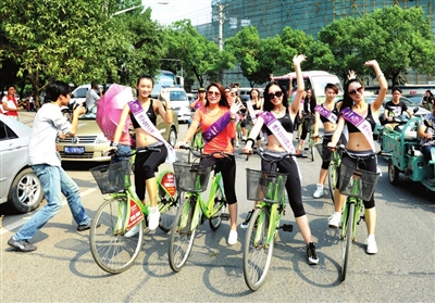 22日,沐浴着户外阳光,佳丽们参加了“绿色咸宁环保行”活动,当她们骑过终点线时,脸上满是愉悦的笑容。(图④)
