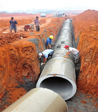23日,咸宁大道东段延伸工程施工现场,工人正在建设地下管网。