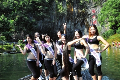 19日,参加2013咸宁国际旅游小姐菁英赛的佳丽们,在华中最美溶洞 ——通山隐水洞开展巡游活动。 通讯员 蔡祖峰摄