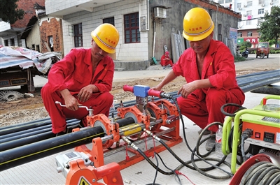 19日,通山县城区天然气工程项目施工现场,工人们正在进行管子热熔对接操作。
