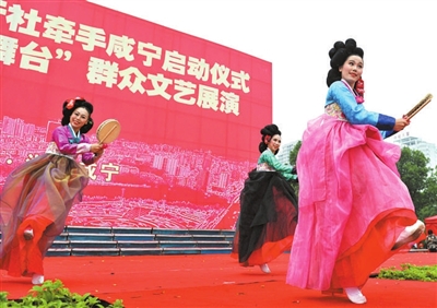 既有自家的表演,也有来客们的表演。当韩国舞蹈《太平舞》开演时,让观众们眼前一亮。舞蹈演员们身着色彩艳丽的民族服装,头上别着高耸的发髻,水袖飞甩,舞姿曼妙,动作纤细优雅,一颦一笑韵味十足。