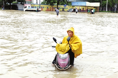 10月7日,浙江省余姚市街头积水严重,行人在马路上小心涉水而行。