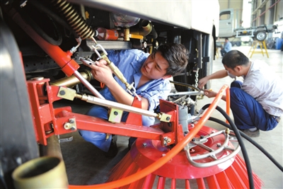 15日,湖北合加环卫公司员工在检查产品质量。近年来,该公司坚持以市场为导向,积极开发环卫新产品,自行研制生产的可卸式垃圾车厢、园林绿化喷洒车厢、多功能高压洗扫车厢等8个系列专用产品在市场上供不应求。记者 袁灿 摄