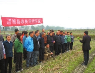 17日,通城县农业局农技人员在塘湖镇狼荷油菜基地向农民讲授田间管理技术。近年来,该局采取进村办班、跨村联训、田间学校等方式,大力培育新型职业农民。 通讯员 徐俊吴练荣摄