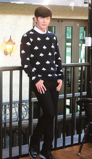 李准基在韩国首尔,身穿扑克牌桃心套头衫搭配一套黑色休闲裤拍摄写真,浓浓的学生气息扑面而来。