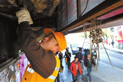 14日,武汉铁路局桥工段咸宁桥工区的技术人员正在咸安南门桥洞进行铁路桥梁的维修工作。“这个桥梁已经出现了一些破损迹象,如果不及时修理,火车经过时就可能掉下小石子,砸到行人。”负责人徐崇健告诉记者,技术人员将认真修补每一处破损,确保行人安全。 记者程慧摄