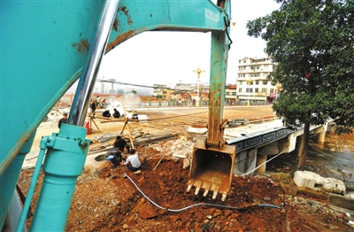 (图1)15日,通山县城徐家大桥正在做桥梁护栏。为满足县城发展需要,通山政府拆除原有的墩上徐桥,并在原址新建徐家大桥。新建桥梁面宽22米,长60多米,双向四车道,去年年底开建,预计11月底可通车。 记者 陈红菊 通讯员 吴涛摄