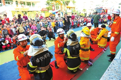 现场进行了地震灾害事故逃生知识授课和疏散演练,师生观看了液压剪剪钢筋、消防器材装备操作演示和云梯车上跳气垫等,小朋友们还亲自体验了一次当消防战士的感觉。