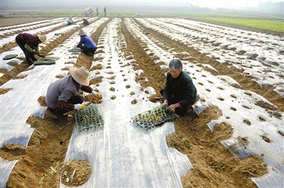 22日,咸安区双溪桥镇郑良村“坡中坡”有机生态基地内,当地村民在种植花菜苗。