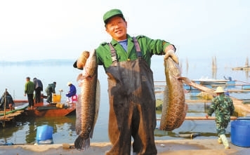 (图2)15日,在嘉鱼县密泉湖,渔民张木林乘快艇回岸,他手里拿的大鳜鱼过秤后,足有6斤6两。渔场场长周呈明介绍,密泉湖渔场有1.2万亩,年产野生鳜鱼、才鱼等达6万斤。