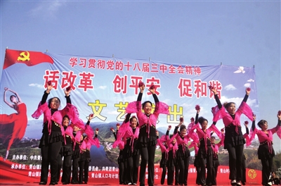 11月30日,崇阳县青山镇广场热闹非凡,来自全镇各村56支代表队聚集这里,献上一台精彩的“话改革、创平安、促和谐”大型文艺演出。整场演出极具地方特色,提琴戏、舞蹈、腰鼓、歌唱、三句半……56个节目全由该镇18个村的村民自编自导自演。