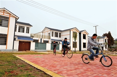 11月28日,赤壁市黄盖湖新河苑新农村一期,3名男孩在广场上自由地骑行。该项目规划总面积369亩,分三期实施。目前,一期已有16户建成,4户在建。