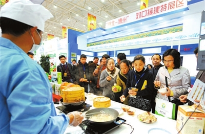 10日,湖北嘉安食品有限公司生产的“西流湾牌”簰洲圆子喜获第十一届中国国际农产品交易会参展产品金奖,并和“西流湾牌”臭干子一道荣获第十届中国武汉农业博览会产品金奖。图为武汉市民在博览会现场争尝簰洲圆子。 通讯员 雷平摄