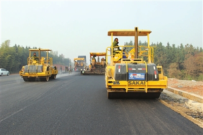 4日,嘉鱼县官桥镇三环线路段施工现场一片繁忙,工人们正在有序地铺设沥青和压实路面,这标志着该县三环线刷黑工程全面铺开。