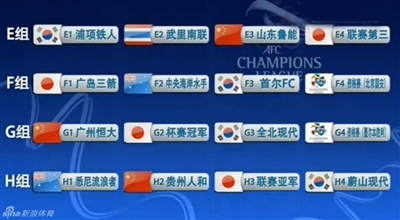 在E组,只有韩国K联赛冠军浦项制铁能给山东鲁能带来威胁,而广州恒大和全北现代预计将继续占据G组头两名。贵州人和的情况要艰难一些,蔚山现代和日本J联赛亚军均是较强的球队,而西悉尼流浪者在上赛季澳超的表现也很不错。