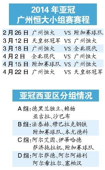 由于有巴西世界杯,所以亚冠提前到明年2月25日和26日开幕,3月11日、12日打小组赛第2轮,第3轮时间是3月18日和19日,4月1日、2日打第4轮,4月15日、16日进行第5轮,4月22日、23日进行小组赛最后一轮。