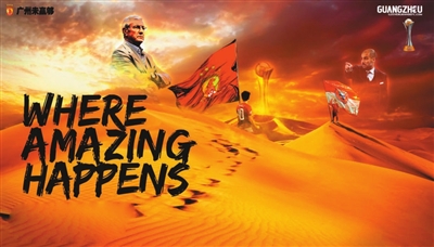 在象征着北非的沙漠上,里皮和瓜迪奥拉的身影出现在空中,但是里皮的身形明显要大过拜仁主帅瓜迪奥拉,气势上更胜一筹。海报的左下方,标注了对阵双方比赛时间等内容。海报最令人注目的,是“WhereAmazingHappens(奇迹发生的地方)”的标语,暗示恒大想要在北非这个发生过奇迹的地方,和欧洲冠军掰一掰手腕,决战的气势一览无遗。