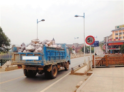 “牌子已经竖起来很长时间了,过桥的车不可能看不到。”一号桥头一商铺老板告诉记者,虽然限重标志在那里,但每天都有不少拉石头及其他工程用料的卡车从这里过桥,至于卡车是否超重,无法判断。