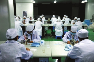 9日,湖北(通山)科海医用卫生材料、橡胶制品有限公司员工在赶制外销产品。据悉,由该公司生产的医用橡胶手套、口罩在市场上供不应求。记者袁灿摄