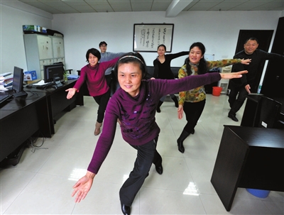 六分钟后,一套操做完,科员蔡春芳额头已有微汗。“上班时间活动一下,蛮好,好像回到了学生时代。”她说,单位每天10点准时放音乐,已经两年多了,从被动到主动,既调节心情又联络感情。