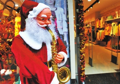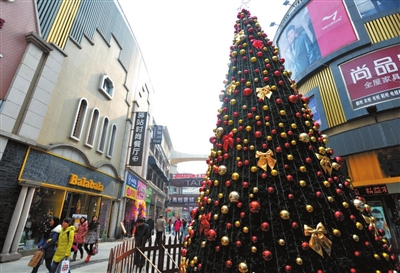 18日,市民从街头圣诞树旁走过。圣诞将至,城区街头出现不少圣诞元素的装扮,很多商家抓住商机,纷纷用圣诞树、圣诞老人、圣诞袜等装扮店面,街头圣诞氛围渐浓。 记者 夏正锋摄
