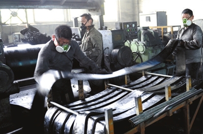 10日,湖北(赤壁)司克嘉耐磨橡胶制品有限公司员工在加工外销产品。该公司总投资1.1亿元,主要生产球磨机用耐磨橡胶板。目前,公司发展势头良好,预计年产耐磨橡胶达4000吨,产值近亿元。