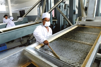 (上图)16日,通城县双狮茶业有限公司员工在制茶。近年来,该公司投资1.4亿元扩大规模,年产茶叶预计可达5000吨,实现销售收入3亿元,将成为全市规模最大的茶叶精加工生产基地。