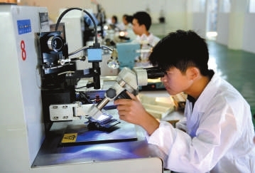 (左图)12日,湖北(通城)精创电子有限公司技术员在生产。该公司总投资5000万元,主营LED发光器件、LED电子显示屏等。今年5月开工,年底试生产,预计年产值可达1亿元,创利税3000万元。 记者 袁灿 摄
